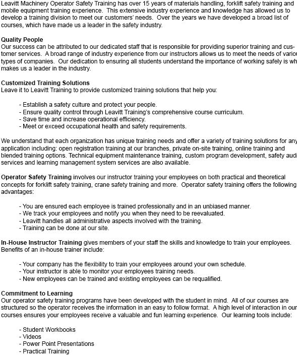 Our large number of programs should ensure that you will come across the right one for you or your staff. Whether you are looking for someone to come instruct at your workplace or would prefer to train at our facility, we can accomodate all your requests. Every course can be tailored to your equipment and workplace.